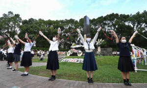 今年の長崎平和祈念式典は参加者を例年の1割(約500人)に限定し、新型コロナウイルス感染拡大防止のため手袋をつけリボンで円を描いたそうです。